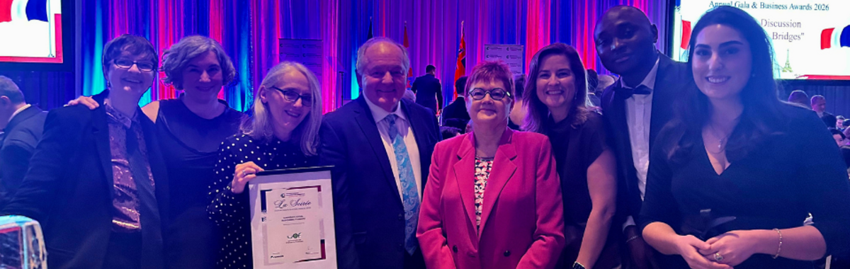 Toronto, le 17 mars 2026 — Lors du gala annuel de la Chambre de commerce France-Canada Ontario (FCCCO), tenu le 12 mars dernier, l’Université de l’Ontario français (UOF) a reçu le prix de la responsabilité sociale d’entreprise – « Corporate Social Responsibility », dans la catégorie Petite Moyenne Entreprise. Cette distinction souligne l’engagement de l’université envers la responsabilité sociale qui se trouve de fait au coeur de son ADN tant dans sa mission, que dans sa gouvernance, son fonctionnement interne, les valeurs transmises dans ses programmes études et ses initiatives de recherche.